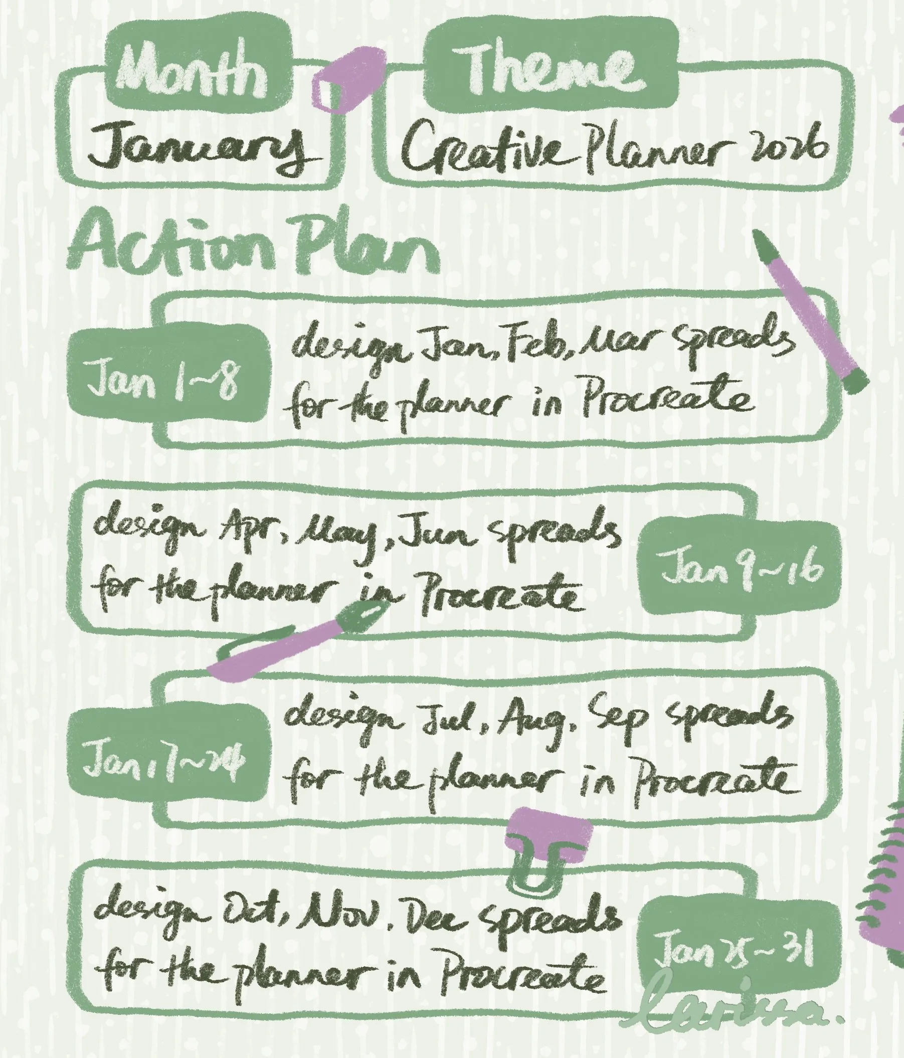This month (January 2026) we will learn to design the 2026 Creative Planner in Procreate. We have made a planner for 2025 a year ago, and now we will make a new one for the new year, continuing to plan and document our creative work along the way.