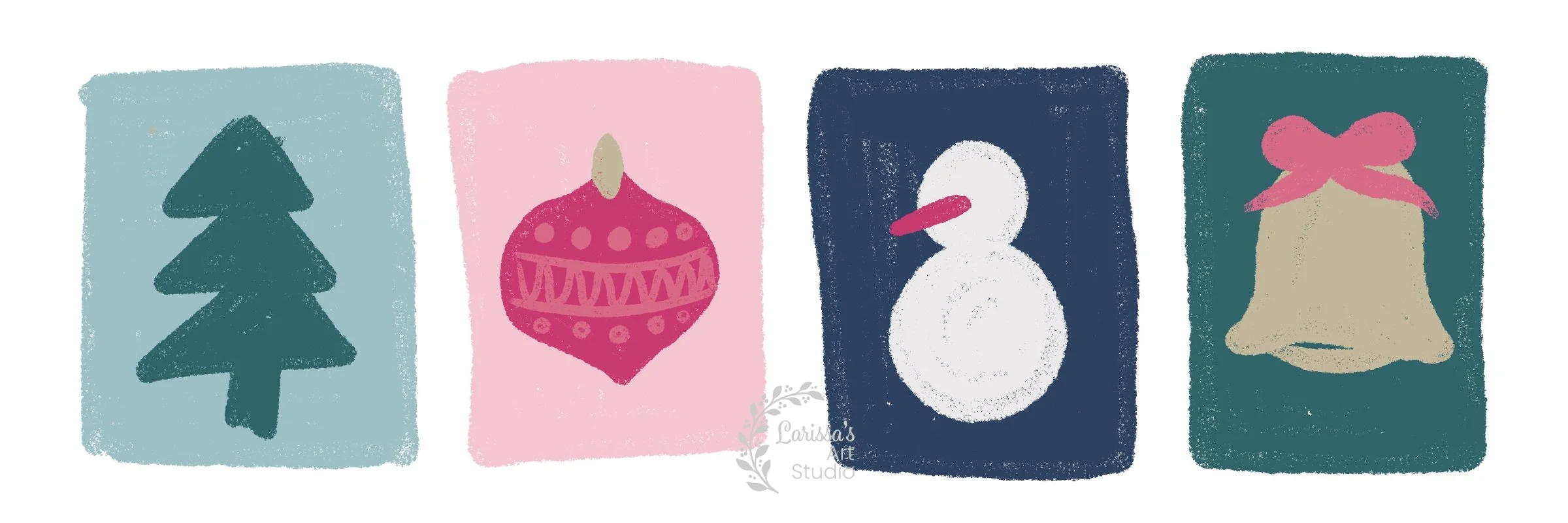 I planned the series in color sketches. At first, I planned to draw just one object in each stamp. I kind of stuck to this plan in the end but also made a couple of changes: I drew the second stamp as three Christmas baubles instead of one, and I drew a Christmas wreath instead of a Christmas bell in the last stamp. In fact, I also tried drawing a gingerbread house before I settled on the idea of a Christmas wreath. But in the end, I believe the following subject matter in each stamp would better suit my illustration style for this series, which is to use color shapes to construct the subject matter, and then draw line details on top: a Christmas tree, three Christmas baubles, a snowman, and a Christmas wreath.
