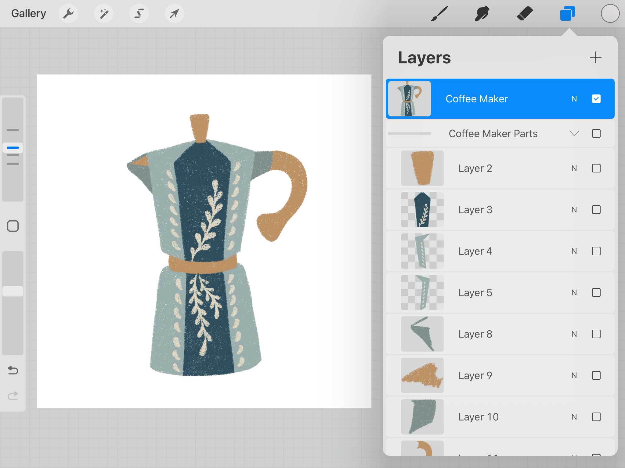 I suggest you start the practice by drawing lots of coffee and tea items and equipment and drawing them in separate files in Procreate. Because when we create the scenes later, we will drag and drop each of these items into a new canvas and place them properly.